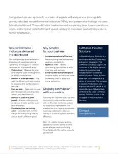 The Picking Time Data Audit is a one-time AI-driven analysis designed to evaluate picking performance by analyzing key warehouse data points. This audit provides actionable insights into the efficiency of pickers, order processing times, and cost per pick, helping businesses identify bottlenecks and optimize labor, machine usage, and overall workflow.